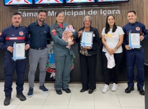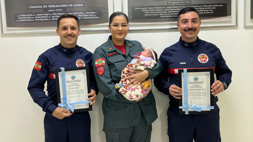Os bombeiros envolvidos foram homenageados na Câmara de Vereadores de Içara, em reconhecimento ao atendimento que ajudou a trazer uma nova vida ao mundo. A proposta foi do vereador Charles Cargnin, que destacou a importância de valorizar quem está pronto para agir em qualquer situação.