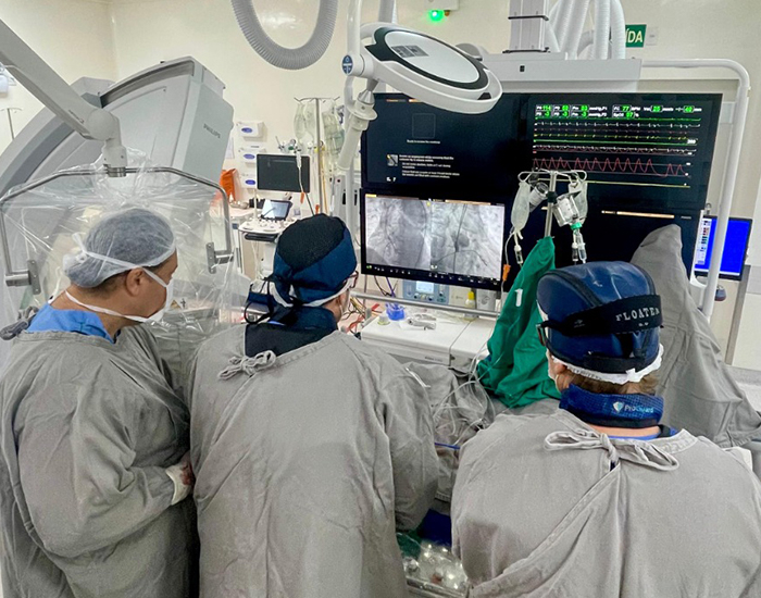 A intervenção envolveu uma equipe completa, com hemodinamicistas, cirurgião cardiovascular, anestesista e profissionais de apoio, garantindo acompanhamento integral ao paciente.