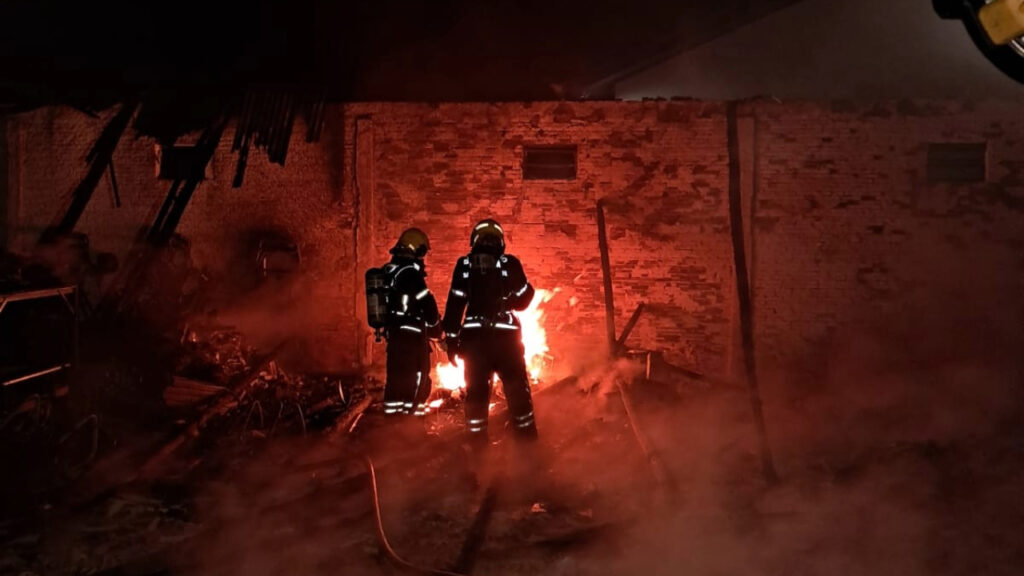 A estrutura, com aproximadamente 400 metros quadrados, foi fortemente atingida pelo fogo.